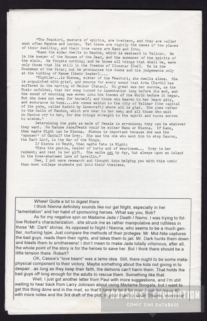 Notes for participants in a big crossover story that appeared, at least in part, in Fantasy Theater. This may have just gone out to associated parties, I'm not sure.