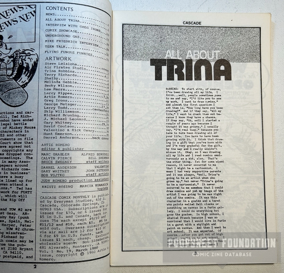 Steve Leialoha, Trina Robbins, Terry Richards, Shelby, Melinda Gebbie, Becky Wilson, Lee Marrs, Larry Rippee, Artie Romero (Ed Romero), Greg Irons, George Metzger, Larry Todd, Skip Williamson, Richard Bruning, J. Michael Leonard, Gary Whitney, David Coulson, Jim Valentino, Rick Geary, Hunt Emerson, Darrel Anderson